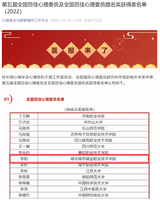 会上公布了第五届全国百佳心理委员名单。经院、校两级推荐、网络评比、全国百佳心理委员论坛组委会评审后,湖北城市建设职业技术学院建筑设计学院2021级李阳同学从来自全国各地高校的297位参赛选手中脱颖而出顺利登榜,荣获“全国百佳心理委员”荣誉称号。这是湖北城市建设职业技术学院学子首次入选全国百佳的心理委员,也是心理委员这一心灵使者的最高荣誉。