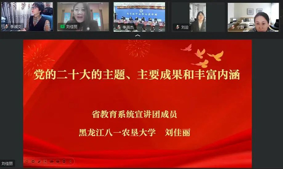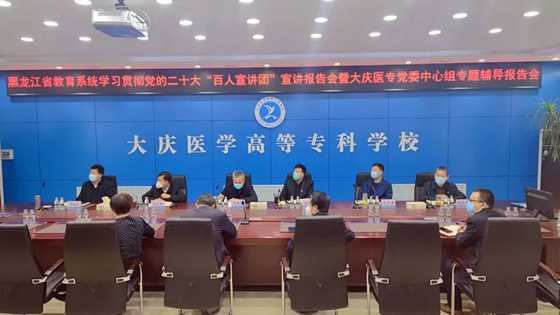 为全面深入学习党的二十大精神,扎实推进学习宣传贯彻工作,12月15日上午,大庆医学高等专科学校党委邀请黑龙江省教育系统“百人宣讲团” 成员、八一农大党委宣传统战部副部长、哈尔滨师范大学马克思主义学院博士刘佳丽,以线上线下结合方式为学校党委理论学习中心组和师生作专题宣讲报告。学校领导班子成员、中层干部、各级党组织书记、思政课教师、组织员、辅导员和学生代表80余人聆听了报告。会议由党委书记冯树义主持。