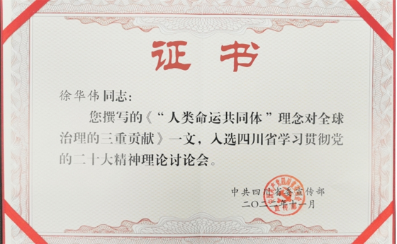 党的二十大胜利召开后,川北幼儿师范高等专科学校马克思主义学院抓早动快,组织思政课教师撰写理论文章16篇,经学校党委副书记李成保、宣传统战部、科研处等部门负责人初评,指导修改并择优推荐3篇理论文章到市委宣传部复评,市委宣传部指导修改并推荐至省委宣传部终评,最终理论文章《“人类命运共同体”理念对全球治理的三重贡献》入选四川省学习贯彻党的二十大精神理论讨论会。