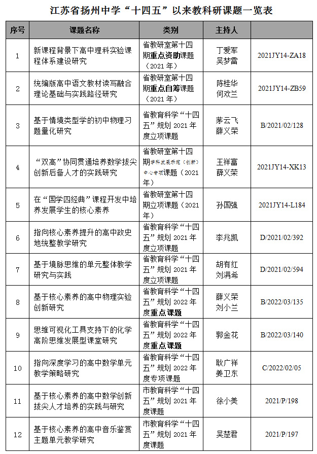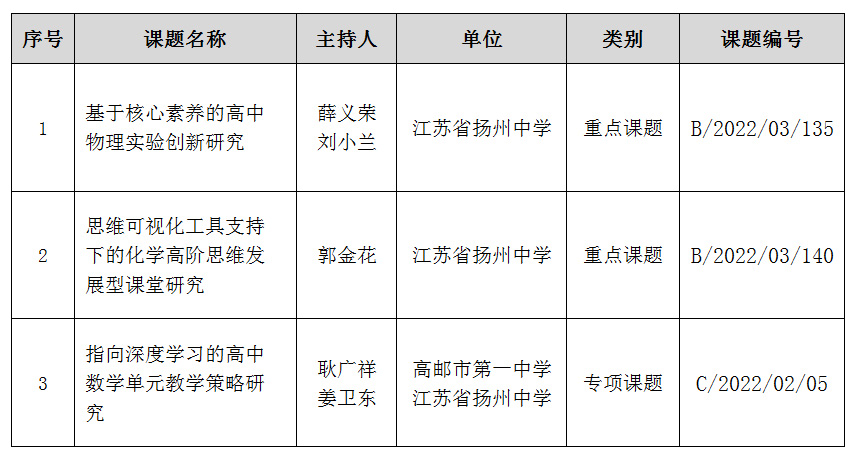 江苏省教育科学规划2022年度课题最终评审结果公布,江苏省扬州中学再添3项省级规划课题。具体如下: