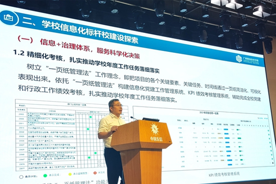 推进会共设基础教育、职业教育、高等教育数字化转型等3个平行会议,邀请了来自高校、政府、企业的专家代表,围绕教育数字化转型作专题报告和案例分享。学校校长梁裕在职业教育数字化转型研讨会上,以《加快数字化转型建设、推动学校高质量发展——广西职业技术学院信息化标杆校建设经验分享》为题进行案例分享。梁裕表示,广职院作为全国高等职业院校治理体系建设典型院校、教育部首批全国信息化能力提升培训基地、广西第一批职业教育信息化标杆校建设单位,不断坚持探索职业教育数字化转型发展路径,已在治理体系、人才培养、专业升级、教师培养、校务管理等五方面运用“信息+”,推动实现决策、管理科学化、智慧化、网络化,助力学校高质量发展,积极为数字广西、数字中国建设贡献广职力量。(图:邓洪燕 文:陈瑜 编辑:陆仕臣)