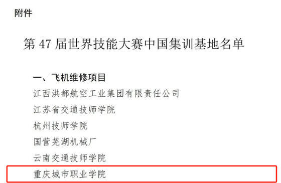 近日,人力资源社会保障部发布《关于确定第47届世界技能大赛中国集训基地的通知》,重庆城市职业学院获批第47届世界技能大赛“飞机维修项目”中国集训基地。