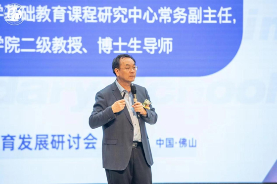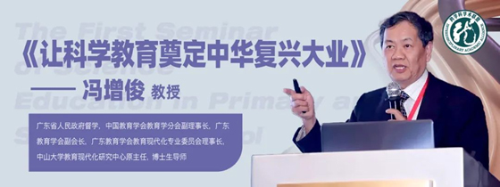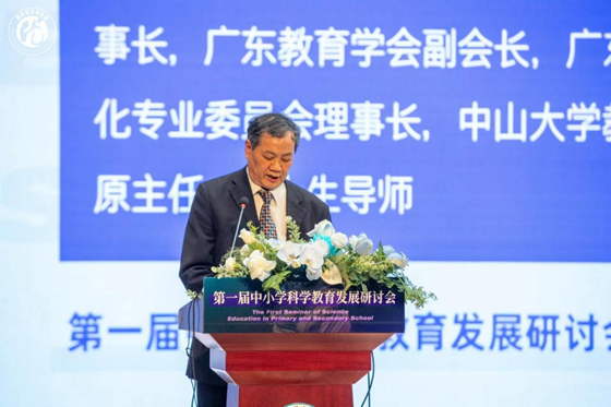 第二位演讲嘉宾,主办方代表——广东省人民政府督学,中国教育学会教育学分会副理事长,广东教育学会副会长,广东教育学会教育现代化专业委员会理事长,中山大学教育现代化研究中心原主任,博士生导师冯增俊教授,以重要学术发言作开幕辞。冯教授演讲主题是《让科学教育奠定中华复兴大业》,演讲中提到“科学教育是教育现代化的核心命题,更重要的是预示教育评价专委会对当前教育改革的方向性把握”、“我们的科技教育错在哪里呢?主要有两点:从历史上看,历经数百年直到隋唐时代才建立起通过科举考试拿文凭做官,延续到现在的科技教育实际上已成为文凭科技,而不是真正的科技能力,更无法实现科技创新。因为中国的STEM教育实际上要的是一张“文凭”,而不是改造社会的能力,这使我们培养的科技人才缺乏开创性、创新性;其二,由于中国实行的文凭科技,因此中小学阶段教育只是学一般普通知识,叫基础,科技被看成是专业、技艺,是有碍于儿童高级发展的,所以只能在人的发展定型后才能去学习。所以,在中国,科技教育是一种大学阶段的教育,而且为了强调科技教育的学术型学位而一而再三地强化其理论性,从而使科技教育失去了技能性和创新能力。冯教授的发言字字珠玑,直指贯彻科学教育的痛点,需要学界、社会共同改变意识,从儿童教育做起,这样才能更好地为中华复兴培养顶尖科技创新人才。