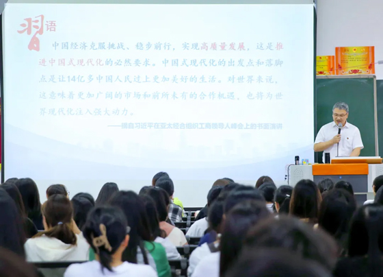 杨翀副校长以“中国经济高质量发展扎实推进”为主题,从回升向好韧性强、全面长远辩证看、多措并举提质量三个方面讲授中国经济高质量发展的具体内容。他从短期和长远两个角度解读中国经济发展面临的风险和机遇,强调我国经济长期稳定发展具备多种优势,我们要有应对风险挑战、推动经济行稳致远的坚实底气。