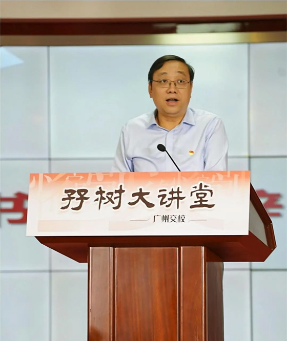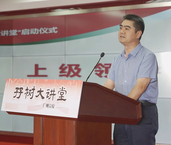 启动仪式的第三项议程是广州市教育局科研处四级调研员邱国俊致辞。他充分肯定了学校开展“孖树大讲堂”的积极意义,并指出在新时代中国特色社会主义事业全面进入新阶段的背景下,学校作为培养德智体美劳全面发展的社会主义建设者和接班人的主要阵地,其文化建设重要性更为凸显。“孖树大讲堂”活动的举办,彰显了校园历史文化魅力,弘扬优良传统,对于营造优良校风,增强师生对学校的认同感、归属感和荣誉感具有极大的推动作用。