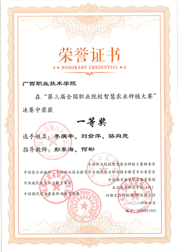 近日,第三届全国职业院校智慧农业种植大赛结果揭晓。由广西职业技术学院农业工程学院现代农业技术专业群教师彭东海、何彬共同指导,园艺技术专业学生李庚辛、刘俞萍、骆向苑组成的参赛团队荣获全国一等奖和最佳质量奖。