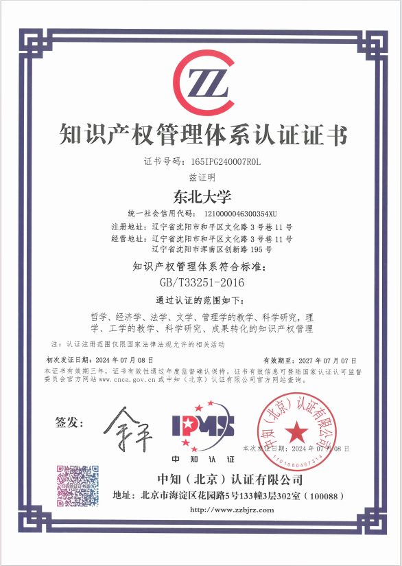 7月8日,东北大学通过了由国家知识产权局、教育部和中国标准化研究院联合编制的《高等学校知识产权管理规范》(GB/T33251-2016)国家标准审核认证,取得了《知识产权管理体系认证证书》。