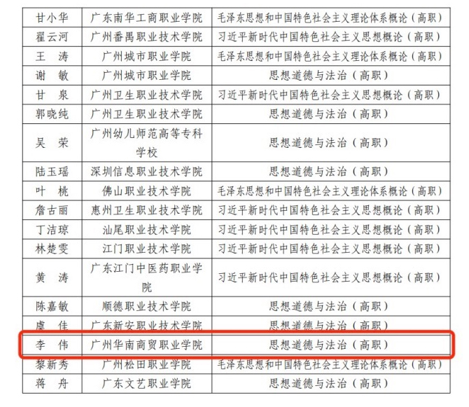 近日,根据《广东省教育厅关于公布2024年度广东高校思想政治理论课教师教学基本功比赛结果的通知》获悉,广州华南商贸职业学院马克思主义学院教师李伟荣获三等奖。