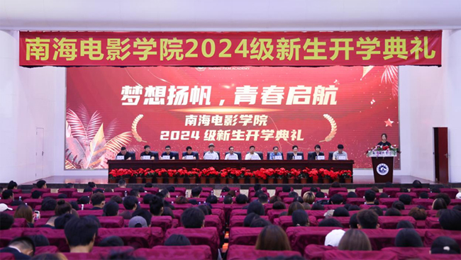 9月24日上午,海口经济学院南海电影学院2024级新生开学典礼于学校小礼堂隆重举行。海口经济学院董事长曹成杰,校长陈啸,北京电影学院原院长、学校名誉校长张会军,执行校长朱华友,马来西亚美兰大学执行董事长、南海电影学院名誉院长曹菲,学校副校长、总会计师刘利国,学校副校长曹阳,南海电影学院执行理事长俞浩、执行院长刘棋芳、党支部书记汤华、行政院长杜彤等领导出席了典礼。著名表演艺术家、导演、制片人、主持人、国家一级演员张国立老师作为特邀嘉宾亲临活动现场。开学典礼由学校党委副书记刘小书主持,南海电影学院全体生参加。