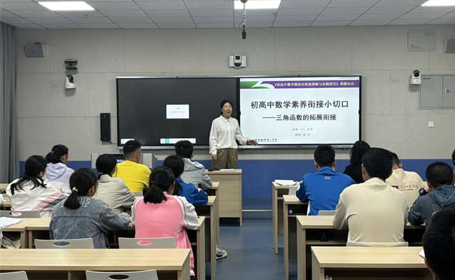 本次讲座由教务处主任肖萍主讲,她以“初高中数学素养衔接小切口—三角函数的拓展衔接”为题展开,从初高中三角函数关联结构图、2024中考题再现到五个拓展衔接小切口,引导同学们探究用已有的知识和经验解决新问题的方法,真正从“解题”走向“解决问题”。