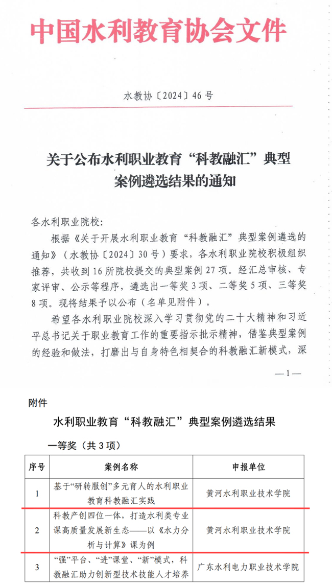 近日,中国水利教育协会公布首批水利职业教育“科教融汇”典型案例遴选结果,黄河水利职业技术学院《基于“研转服创”多元育人的水利职业教育科教融汇实践》和《科教产创四位一体,打造水利类专业课高质量发展新生态--以《水力分析与计算》课为例》典型案例双双荣获一等奖。