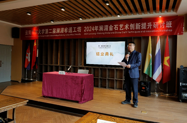 中央美术学院肖勇教授对云南民族大学在非遗传承和国际教育交流方面的努力表示赞赏,期望学校能继续加强澜湄非遗文化交流,鼓励学员们在金石技艺上不断创新。