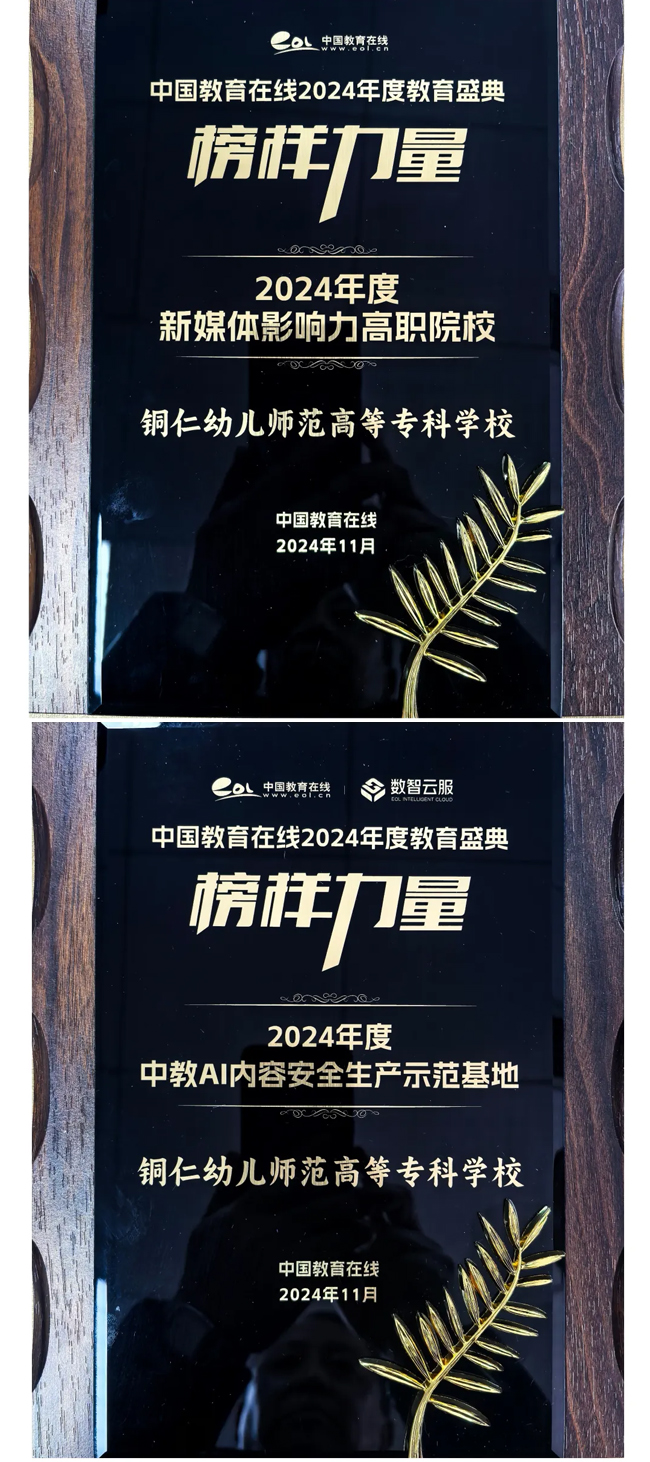 近日,中国教育在线“榜样力量·2024年度教育盛典”评选获奖名单揭晓,铜仁幼儿师范高等专科学校荣获“2024年度新媒体影响力高校”“2024年度中教AI内容安全生产示范基地”两项荣誉称号。