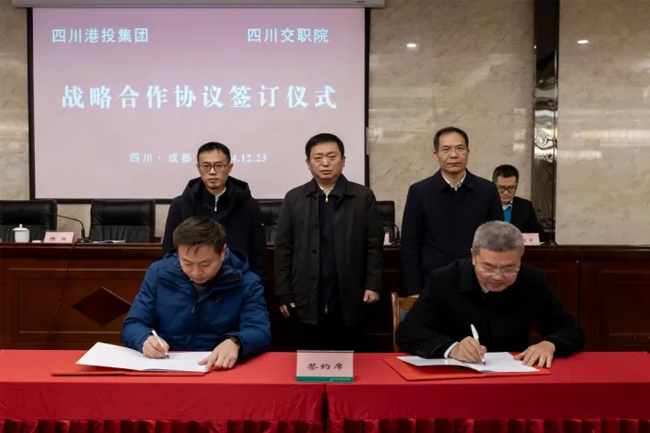 12月23日上午,四川交通职业技术学院与四川省港航投资集团有限公司(简称:四川港投集团)战略合作协议签约仪式在学院举行,四川港投集团党委副书记陈日、党委组织部(人力资源部、港投学校)部长张乔,学院党委书记冯书明,党委副书记、院长陈斌,党委委员、副院长谭亮出席签约仪式。