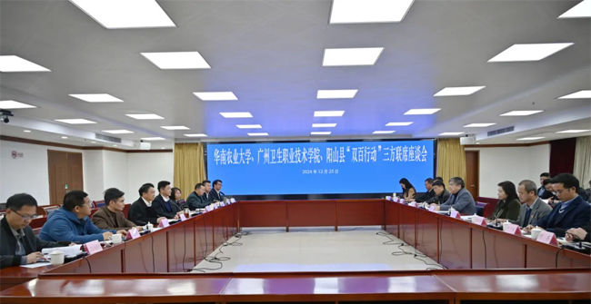 12月25日上午,华南农业大学、广州卫生职业技术学院与阳山县“百校联百县助力'百县千镇万村高质量发展工程’”(简称“双百行动”)三方联席会议在阳山县人民政府举行。华南农业大学党委副书记、校长薛红卫,广州卫生职业技术学院党委书记余莎,纪委书记刘保其,阳山县委副书记、县长罗振宇,阳山县常委、副书记蔡展鹏等出席会议。华南农业大学、广州卫生职业技术学院有关部门负责人,阳山县有关部门领导,“双百行动”高校驻阳山县服务队参加会议。