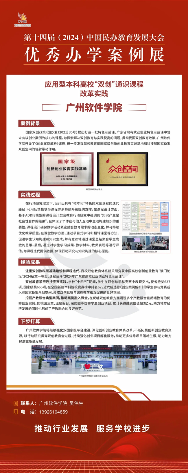 据悉第十四届(2024)中国民办教育发展大会共收到全国600多个民办教学成果案例,从中选出81个项目纳入本届优秀办学案例进行表彰,并“优中选优”,最终在全国遴选出16个民办高校案例在现场展出,广州软件学院案例《应用型本科高校“双创”通识课程改革实践》为其中之一。创新创业学院王柏荣老师代表广州软件学院在展览环节为参会人员介绍获奖案例。