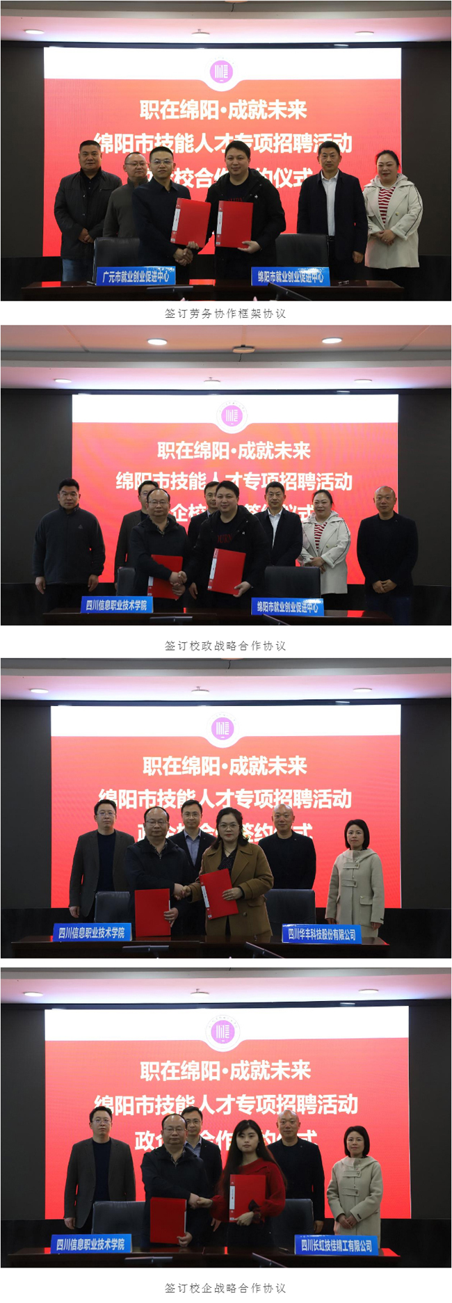 在综合楼0903会议室召开的座谈会上,与会人员围绕政校企三方合作开展技能人才培养、劳务协作、校企合作等话题进行了深入交流,并达成共识。会上,绵阳市就业创业促进中心与广元市就业创业促进中心签订了两地人社劳务协作框架协议;学院与绵阳市就业创业促进中心签订了校政战略合作协议,与四川华丰科技股份有限公司、四川长虹技佳精工有限公司签订了校企合作框架协议。