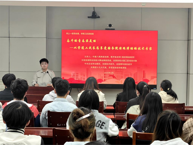 2025年4月9日,全国技术能手、中央企业劳动模范、全国职业技能大赛金牌得主陈宇航老师走进山东城市建设职业学院,以《奋斗的青春最美丽——从管道工成长为享受国务院政府特殊津贴的技术专家》为题,与青年学子分享交流技能成才、技能报国的成长历程。山东城市建设职业学院党委委员、宣传统战部部长秦玉学出席活动。