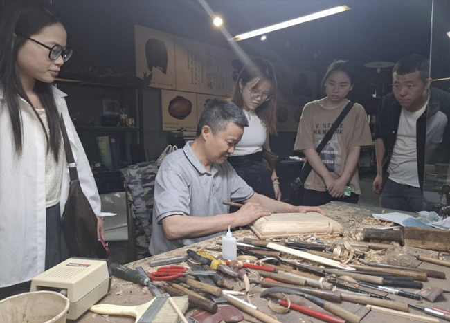 5月6日,团队在荆楚非遗传承院向第四代传承人邹传志学习漆器制作技艺。团队负责人黄海萍体验了木模胚打磨工序,深刻感受传统工艺的精髓。