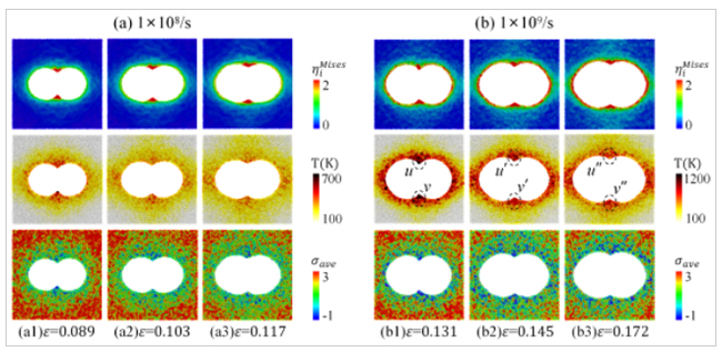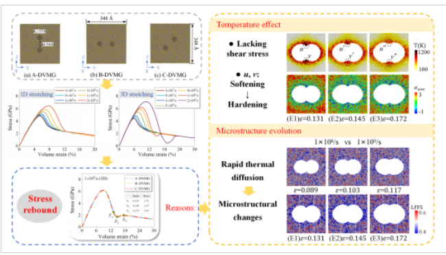 然而,在3D动态加载下,孔洞合并后,孔洞周围的温度呈现出降低趋势,且这一趋势随着加载应变率的提升变得越来越显著。从原子堆垛的角度来看,随着孔洞周围温度的降低,力学稳定的<0,0,12,0>原子Voronoi多面体团簇的数量会恢复。在非晶结构中,<0,0,12,0>团簇的含量越高,金属玻璃材料的强度也会相应越高,因此,金属玻璃在孔洞合并后会经历异常的应力回跳现象,产生了意外的微观结构硬化效应。但是,这一效应在晶态金属中并不存在。此外,团队的进一步研究也证实了应力回跳的强度可以通过调整孔洞特性或材料参数来控制。这种不寻常的应力回跳现象的揭示将对金属玻璃及其符合材料的极端条件应用具有重要的工程价值。
