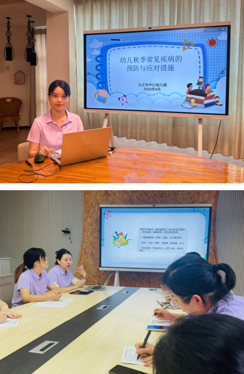 幼儿园专职保健医生王琳、詹迪担任主讲人,她们围绕秋季幼儿常见疾病的症状及发病原因展开系统性讲解。从呼吸道感染的典型表现,到腹泻的传播途径,再到手口足病的皮疹特征、过敏性鼻炎及哮喘的诱发因素,两位医师结合幼儿园日常案例,将每种疾病的核心症状、潜在发病风险进行了详细的阐述,不但让保育教师清晰掌握了疾病特点,更为后续将理论转化为实际护理操作、提升工作实效奠定了坚实基础。