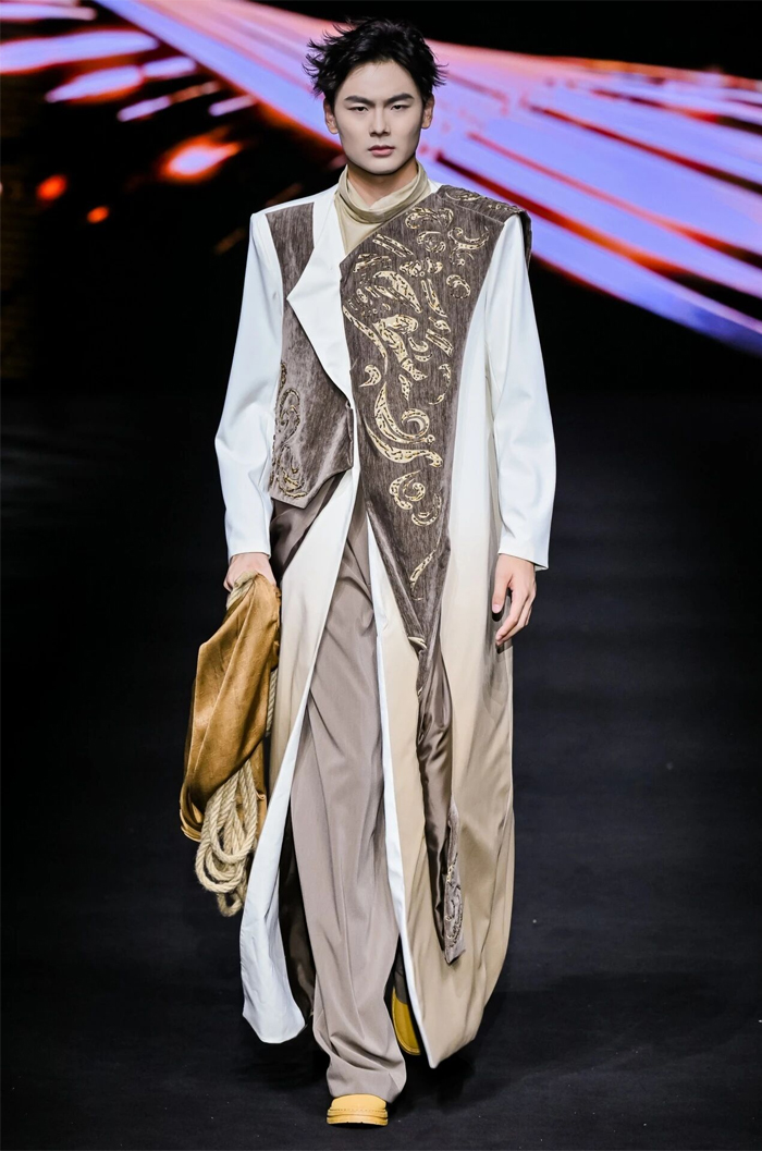广州市纺织服装职业学校则以 “岭南文化” 为内核,推出 “醒狮元素” 与 “香云纱潮牌” 两大主题系列,让传统非遗焕发新生。醒狮系列以朱红、明黄为主色,通过符号提取与日常化设计,将民俗厚重感转化为年轻活力;香云纱潮牌系列则结合宽大版型外套、金属配饰等潮流元素,让“软黄金”走进年轻人的日常穿搭;为迎接第十五届全运会,展演中还特别呈现运动机能风服装,展现青年一代的朝气蓬勃与昂扬风貌。