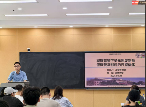 为贯彻落实学校“三个三”发展战略部署,提升教师科研能力,增强整体科研实力,推动学校科研水平迈上新台阶,由长春建筑学院科研处牵头,各学院(部)相继组织承办学术交流系列活动。官网特开设专栏,连续刊载2025年度科研能力提升系列活动,为教师们搭建学习平台,也为学校教育教学创新注入新活力。第二十六期由土木工程学院承办。近日,土木工程学院邀请吉林大学王伯昕教授作“减碳背景下多元固废制备低碳胶凝材料的性能优化”专题学术讲座。学院全体教师与部分学生参加。