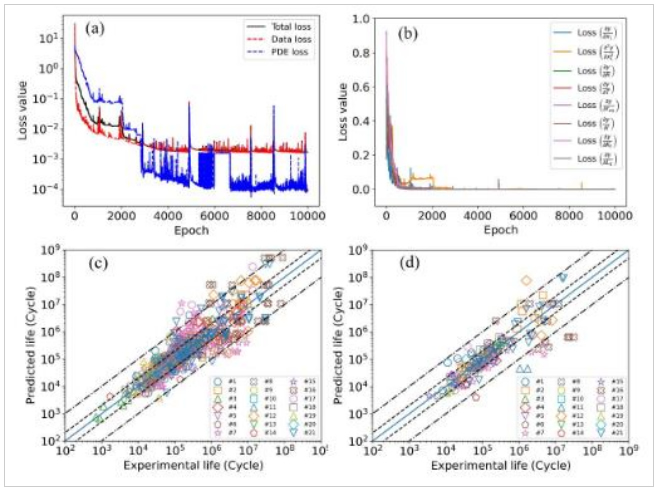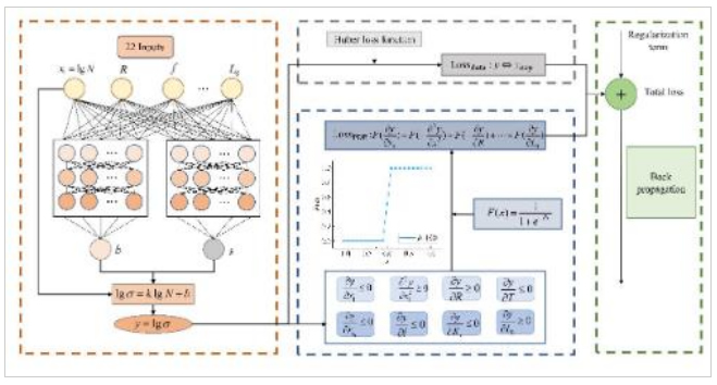 郭然/杨素淞课题组提出 “神经Basquin偏微分方程约束网络” 创新框架,核心突破在于融合物理机制与机器学习,基于Basquin方程构建网络架构,保留物理合理性的同时提升非线性描述能力;将 8 项物理约束(如应力比、温度对疲劳性能的影响规律)以偏微分方程形式嵌入损失函数,引导模型训练。针对文献数据参数缺失问题,团队开发 XGBoost 填补策略,结合均值法完善 856 组高周疲劳数据,构建含 22 个输入特征(涵盖工艺、几何、热处理等)的数据集。