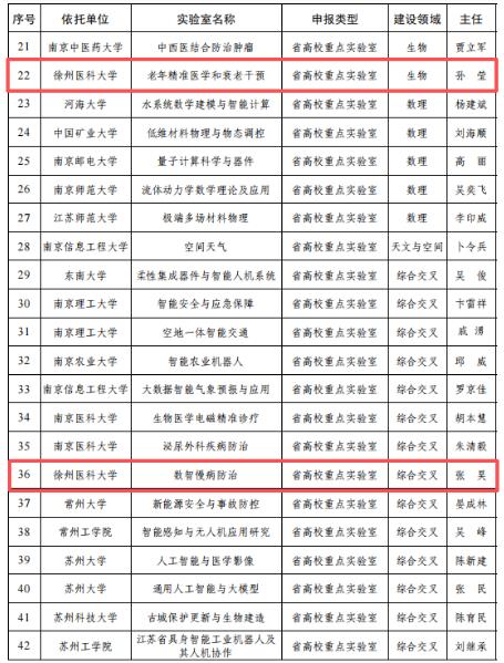 近日,江苏省教育厅正式印发《省教育厅关于公布江苏高校重点实验室新增建设名单的通知》(苏教科函〔2025〕21 号)。徐州医科大学申报的“老年精准医学和衰老干预”“数智慢病防治”两大实验室成功入选省高校重点实验室新增建设名单,标志着学校在老年健康保障、慢性病精准防治领域的科研平台建设与科技创新能力迈上新台阶。