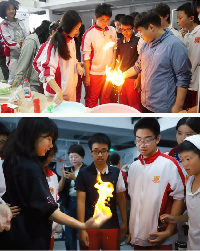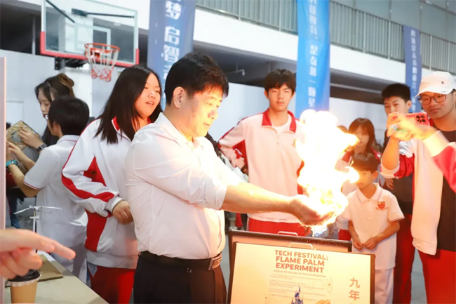 “神奇火焰掌”展台排起了长队,师生家长依次体验掌心“喷火”的奥秘。