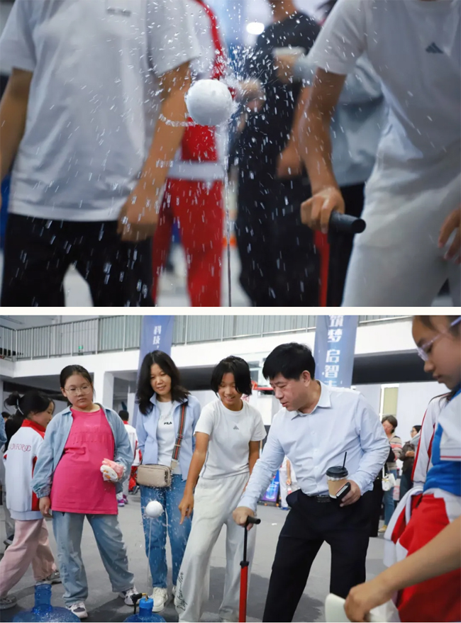 “水柱悬球”前,随着打气筒不断助推,水花纷飞迸溅,球体却稳稳停在空中。