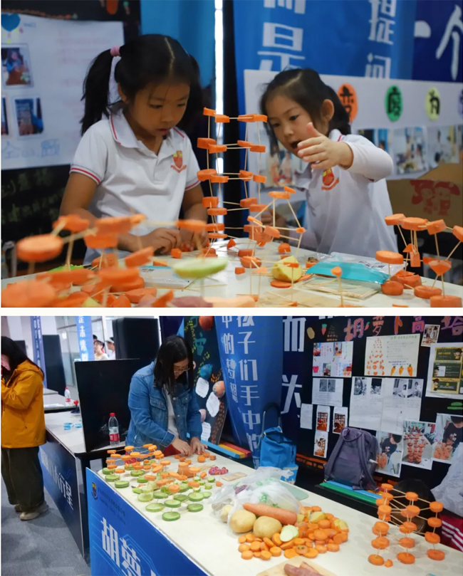 胡萝卜高塔旁,削皮、切块、拼接,学生们分工有序,筑起一座座橙色堡垒。