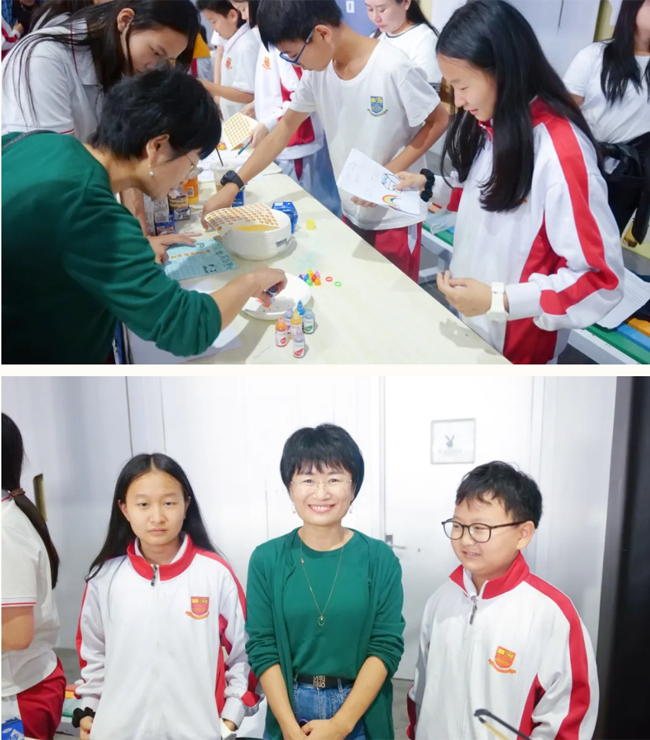 “牛奶彩虹画”前,学生用英文流利讲解原理,邀请家长共同参与实验。