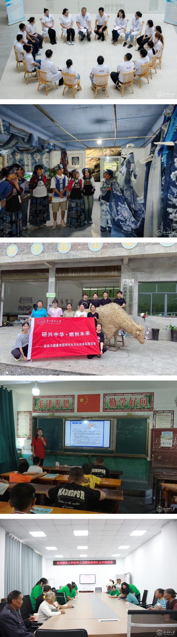 2025年暑期,贵州医科大学积极响应教育部学位与研究生教育发展中心的号召,组织参加研究生新时代伟大变革暑期实践活动。本次实践活动立足医学专业特色,学校充分发挥临床医学、基础医学、公共卫生、药学、护理学、生物与工程、应用心理、公共管理等学科和专业特点,围绕研启新程、研促振兴、研理善政、研育青苗、研兴文化、研护生态6个专题组建了16支“研行中华,燃创未来”暑期实践活动队伍。贵州医科大学各研究生实践团队于7-9月期间分别奔赴省内外20余个地区,深入乡村、社区、景区、学校等,通过义诊科普、社会调查、志愿服务、文化体验、劳动实践、红色教育等形式,将专业知识与服务国家战略、服务人民健康相结合,以助力乡村振兴为主线,辅以医疗卫生知识科普、基层治理现状和行业调研、生态保护、宣传非遗文化等内容,开展实践活动,形成了硕博联动、多学科交叉融合的实践格局。在实践中,研究生学子深刻感悟新时代伟大变革,将论文写在祖国大地上,将学问做在群众需要处。
