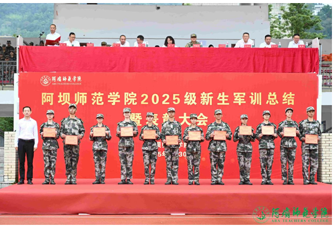 2025级新生军训团政委、学校党委学生工作部部长钟顺秋宣读了《中共阿坝师范学院委员会人民武装部关于表彰2025级新生军训先进集体与优秀个人的决定》,校领导分别为获奖代表进行颁奖。