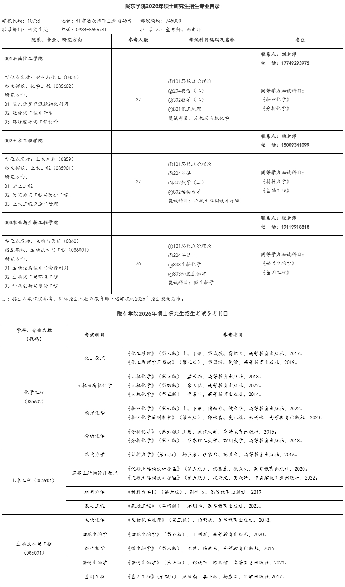 陇东学院2026年硕士研究生招生专业目录及考试参考书目