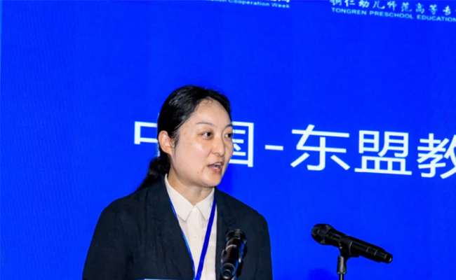 朱玉婷致辞中指出,2008年中国——东盟教育交流周举办以来,双方在教育交流、合作办学、科研协作、人员往来等方面取得丰硕成果,东盟和一带一路共建国家和地区参与嘉宾达5400余人次,参与学校及教育机构10000余个,成功签署教育合作协议或备忘录2100余项,中国—东盟教育交流周已成为中国和东盟最具代表性的政府间教育合作平台。铜仁幼儿师专连续五年承办“铜城黔语·丝露同行”学前教育国际论坛,今年与老挝四省共建“贵匠工坊”、开展“中文+学前教育”师资培训,更是将贵州学前教育的优质资源与经验,转化为服务东盟国家教育发展的实际行动,每一项成果都为中国——东盟学前教育合作积累了宝贵经验。