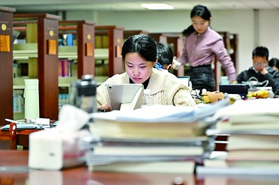 学生在中国海洋大学崂山校区图书馆内上自习。新华社发