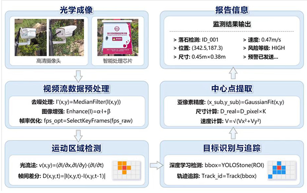 该系统基于计算机图形学、计算机视觉与深度学习相结合的智能监测方法,通过三个关键技术层面实现突破:在运动检测方面,系统采用光流分析和帧间差分算法,可有效捕捉监测区域的异常运动;在目标识别方面,团队自主研发的YOLOStone深度学习模型,基于海量落石图像样本库训练而成,对落石事件的识别准确率超过85%;在精准测量方面,系统采用亚像素级提取算法,将定位精度提升至亚像素量级,实现了对目标位移的高精度测量。
