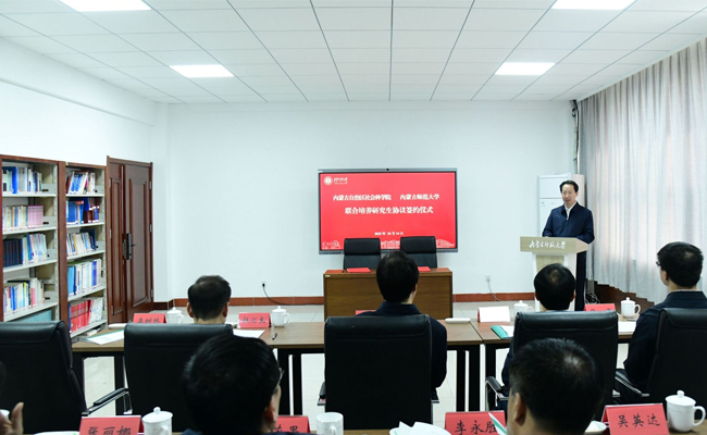 杜汇良在讲话中指出,内蒙古师范大学与内蒙古自治区社会科学院签订联合培养研究生协议,不仅是双方实现优势互补的务实之举,也是加快推进教育强区建设的生动实践。双方要以此为契机,加快推进研究生培养质量稳步提升。一要提高政治站位。认真学习领会习近平总书记重要指示精神,结合民族边疆地区特点,加快构建中国哲学社会科学自主知识体系,推进中华民族共同体学交叉学科建设,推动哲学社会科学创新性发展。二要坚持立德树人。落实好《自治区联合培养研究生管理办法》,优化研究生联合培养方案,深化铸牢中华民族共同体意识教育,加快构建思政育人新格局,形成可复制、可推广的研究生联合培养经验。三要加强科学研究。主动适应科研范式改革,开展跨学科、跨领域、跨部门协同攻关,在加快建构中国自主的边疆学知识体系,加快形成中华民族共同体史料体系、话语体系、理论体系等方面形成一批优秀的研究成果。