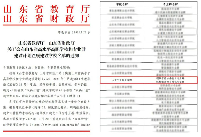 近日,山东省教育厅、省财政厅联合发布了《关于公布山东省高水平高职学校和专业群建设计划立项建设学校名单的通知》,山东工业职业学院凭借深厚的办学积淀、强劲的综合实力及在职业教育领域的突出成绩,成功入选立项建设单位,标志着学校发展迈入高质量建设新阶段。