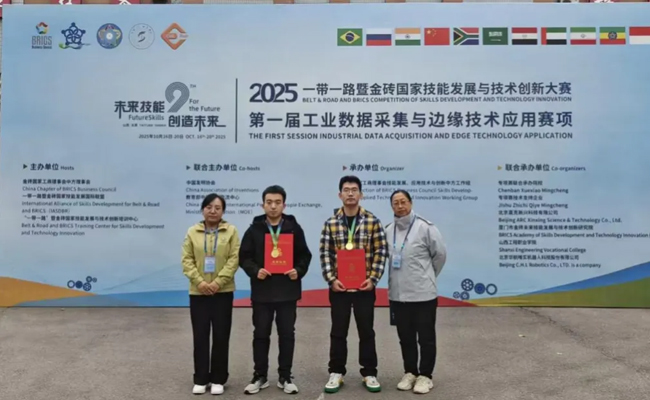 金秋十月,捷报频传。在刚刚落幕的2025一带一路暨金砖国家技能发展与技术创新大赛第一届工业数据采集与边缘技术应用赛项中,天津工业职业学院工业与信息化系教师付晓艳、唐继英带领工业互联网专业学生陈海峰及电气专业学生李旺普组成的参赛团队,凭借扎实的技术功底、默契的团队协作与稳定的临场发挥,从来自全国的100余支参赛队伍中脱颖而出,一举摘得一等奖桂冠,为学院再添殊荣。