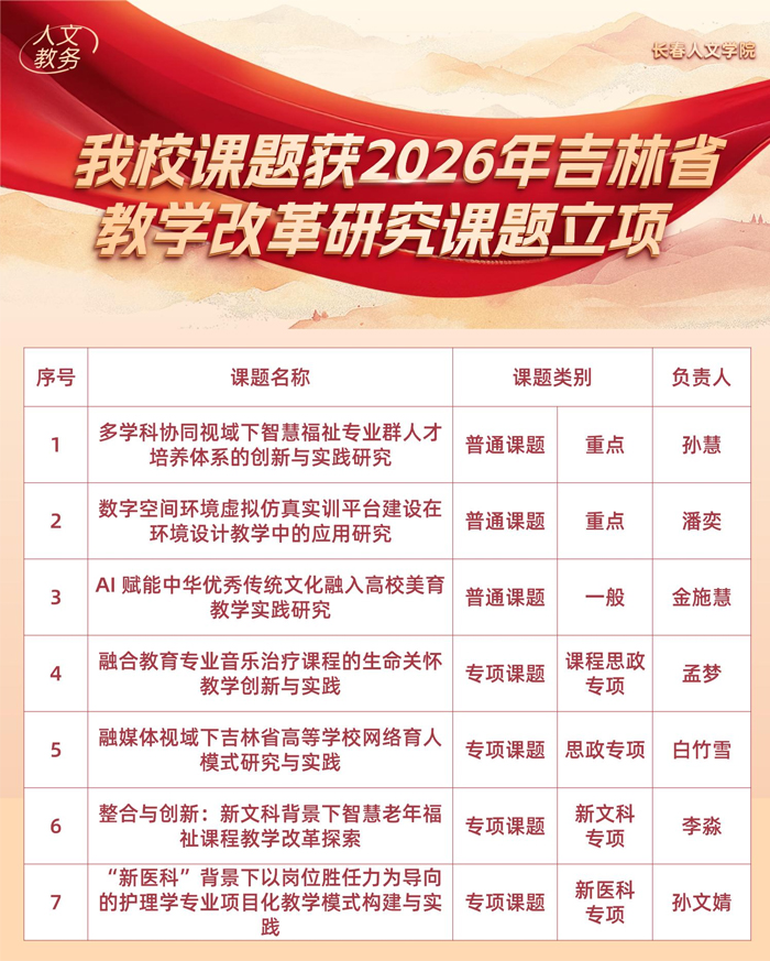 近日,吉林省教育厅发布《关于公布2026年吉林省高等教育教学改革研究课题立项名单的通知》,长春人文学院共有7项课题获批立项,其中重点课题2项、一般课题1项、专项课题4项,立项课题覆盖新工科、新文科、新医科、课程思政等重点建设方向,并在福祉人才培养领域形成鲜明特色。