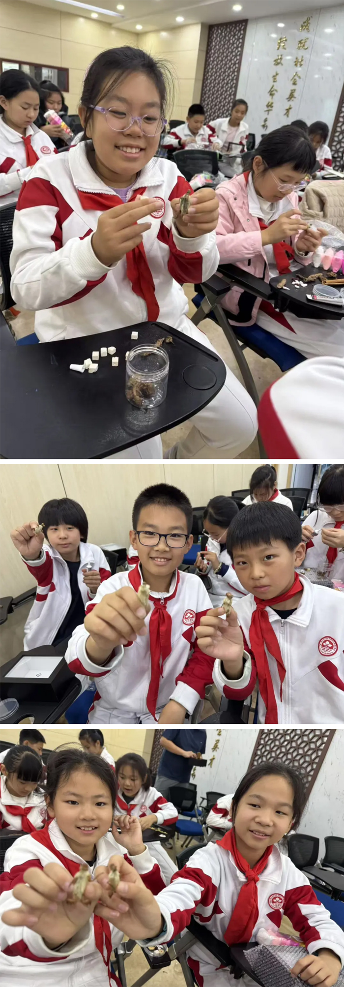 最令人期待的手工制作环节“巧手赋灵猴”开始了。五年级同学们纷纷发挥创意,构思并动手制作专属的毛猴作品。在选材、塑形、搭建的过程中,大家专注投入,有的认真挑选合适的药材,有的专注于用白芨将各个部分精心粘合,有的则与身旁同学交流想法,思考如何让毛猴的形象更加生动逼真。同学们灵动的思维与巧妙的动手能力相结合,一只只栩栩如生的毛猴在大家的巧手中逐渐成型,仿佛被赋予了生命。