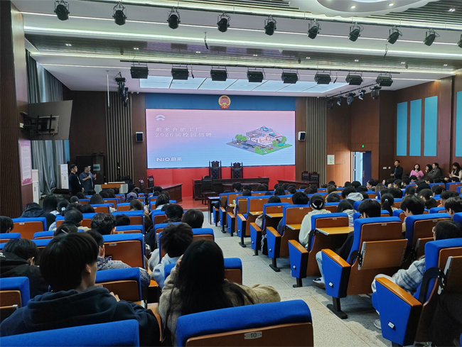 10月22日下午,全球领先的智能电动汽车企业蔚来汽车合肥工厂走进合肥职业技术学院汽车应用与轨道交通学院,在北教学楼开展了校园专场招聘宣讲会。此次宣讲会吸引了该院23级城市轨道交通专业的全体学生参加。