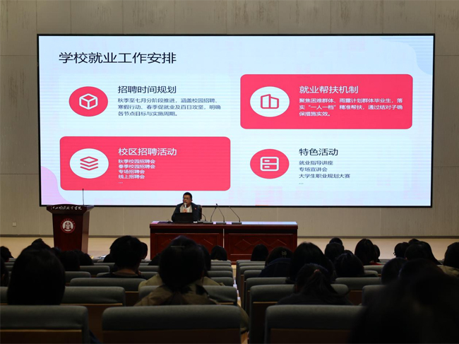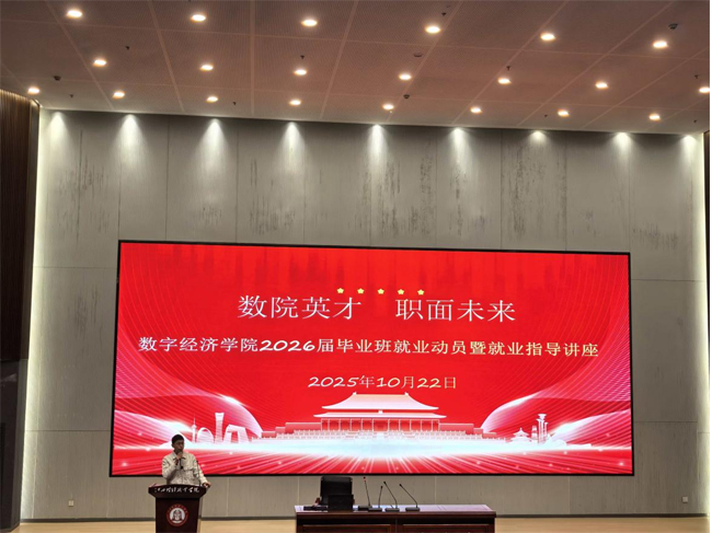 10月22日下午,江西财经职业学院数字经济学院在八里湖校区一号报告厅开展2026届毕业班就业动员暨就业指导讲座,党总支副书记龚威、全体毕业班班主任及2026届毕业生参会。