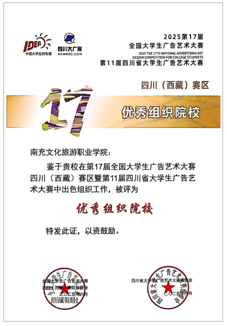 近日,2025年第十七届全国大学生广告艺术大赛四川(西藏)赛区暨第十一届四川省大学生广告艺术大赛(简称“大广赛”)评审结果已揭晓。南充文化旅游职业学院学子凭借扎实的专业基础交出亮眼答卷,在本次大赛中共斩获奖项85项,其中全国优秀奖1项、省级一等奖6项、二等奖31项、三等奖47项,同时学校获得优秀组织单位荣誉称号。