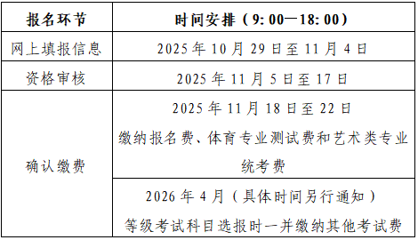 2025年11月18日至22日(每天9:00—18:00)缴纳报名费、体育专业测试费和艺术类专业统考费,其他考试费在考生进行普通高中学业水平等级考试科目选报时一并缴纳。