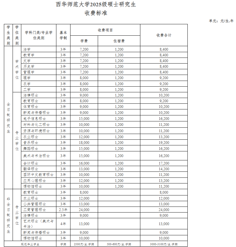 说明:1. 学费收费依据:川发改价格〔2024〕417号文件。2. 住宿费收费依据:川教〔2007〕190号文件。具体标准:①4人间带卫生间1200元/生.年;②4人间不带卫生间、6人间带卫生间1000元/生.年;③7人间带卫生间、6人间不带卫生间900元/生.年;④8人间及以上800元/生.年;⑤1号楼、2号楼套房1200元/生.年。研究生由学校统一安排寝室,按实际入住寝室标准结算住宿费。3. 从2021级开始延迟毕业的学生按2,500元/生.学期收取学费,按600元/生.学期统一收取住宿费,按实际入住寝室标准结算住宿费。4. 工商管理硕士学制2.5年,前两年收费24,000元/生.年,后0.5年每生收费12,000元。