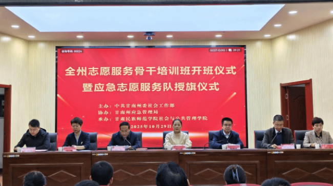 10月29日上午,甘南州全州志愿服务骨干培训班开班仪式暨应急志愿服务队授旗仪式在甘肃民族师范学院图书馆学术报告厅举行。甘南州人民政府副州长王芳、甘肃民族师范学院党委副书记敏贤麟,州委社会工作部部长郭路及相关部门负责人出席仪式。全州参训学员及甘肃民族师范学院社会工作专业师生参加。